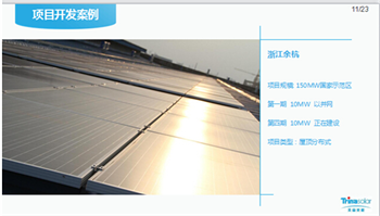 下面我跟大家介紹幾個案例,其中一個浙江余杭,它是國家18+12國家示范區(qū)的項目,總容量是150MW,這是典型離散式分布式的案例。此外還有山東沂水的項目,這是山東沂水地區(qū)最大的三級運營商,上海金山項目,10MW,5月份已經成功并網了。山東齊河項目,5月份已經成功并網。這是連云港光伏村的項目,這是中國光伏扶貧的南北的縮寫,是2013年天合配合江蘇省政協某個領導給予資金支持,然后就誕生了光伏扶貧的概念。本來有領導要去看一下,結果看了一下圖片,不能做推廣,不符合扶貧的概念,但是這個理念已經帶來了模式的改變,光伏扶貧可能真正解決貧困人口的問題。